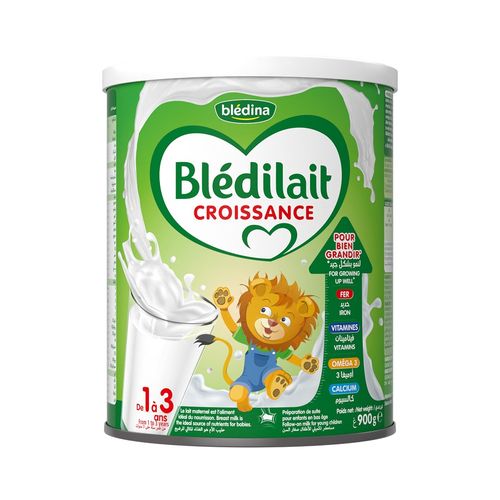 Blédilait Croissance de Blédina est un lait infantile enrichi en vitamines, minéraux, et acides gras essentiels, conçu pour soutenir la croissance et le développement des enfants de 1 à 3 ans. Il offre une nutrition équilibrée sans huile de palme.